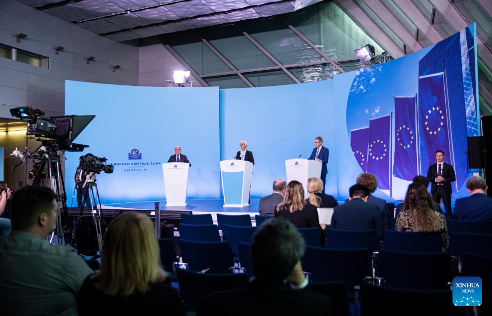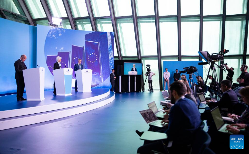European Central Bank (ECB) President Christine Lagarde (2nd L) attends a press conference at the ECB headquarters in Frankfurt, Germany, April 11 2024. The European Central Bank (ECB) on Thursday decided to leave key interest rates unchanged after its regular rate-setting meeting here. (Xinhua/Zhang Fan)