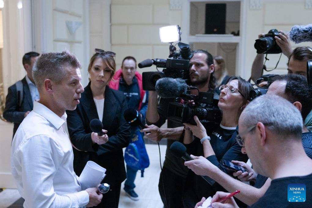 Peter Magyar, a major critic of Hungarian Prime Minister Viktor Orban and his government, speaks to media after the decision of the Hungarian National Election Committee to register the Party of Respect and Freedom (TISZA) for the European parliamentary and Hungarian municipal elections in downtown Budapest, Hungary, on April 11, 2024. (Photo by Attila Volgyi/Xinhua)