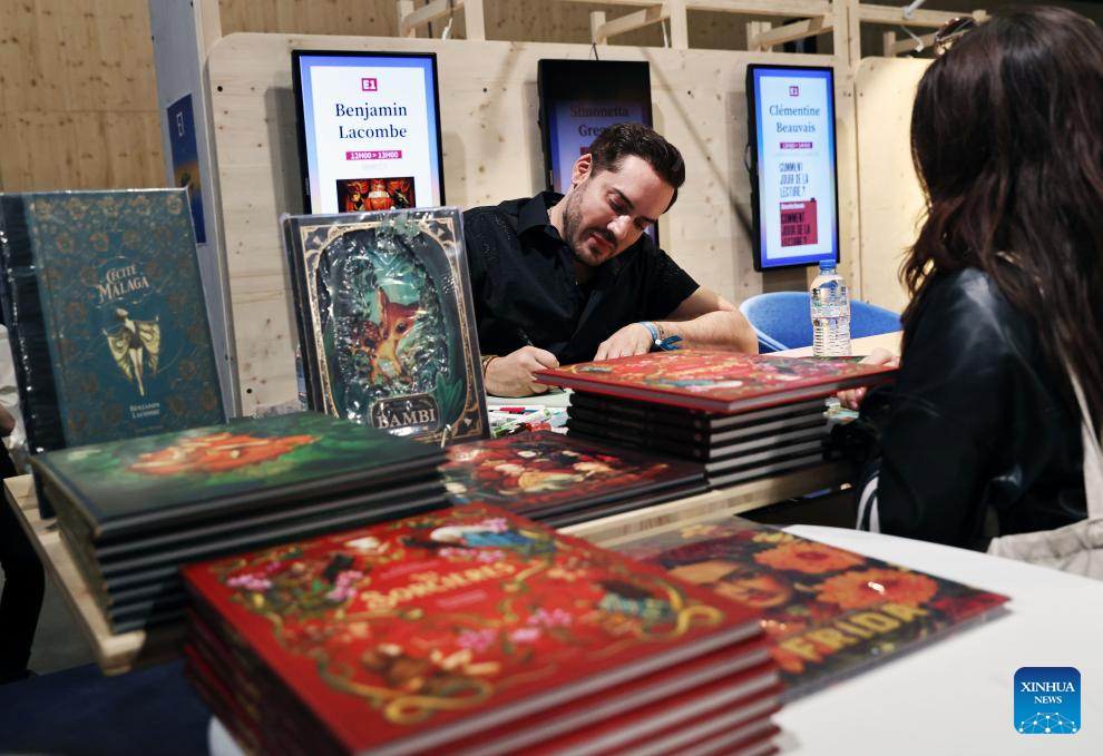 French artist, author and illustrator Benjamin Lacombe signs for readers during the Paris Book Festival 2024 in Paris, France, April 14, 2024. The three-day event concluded here on Sunday (Xinhua/Gao Jing)
