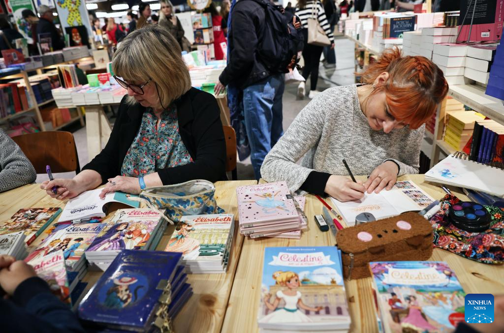 Writers sign for readers during the Paris Book Festival 2024 in Paris, France, April 14, 2024. The three-day event concluded here on Sunday (Xinhua/Gao Jing)