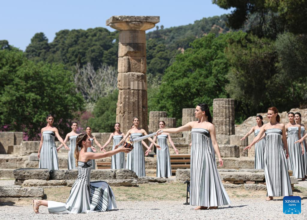 Greek actress Mary Mina (R), playing the role of the High Priestess, passes the flame to the first torch bearer, Greek rowing Olympic champion Stefanos Ntouskos during the final dress rehearsal of the Olympic flame lighting ceremony for the Paris 2024 Summer Olympic Games in Ancient Olympia, Greece, on April 15, 2024. (Xinhua/Marios Lolos)
