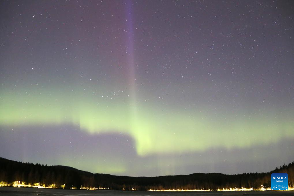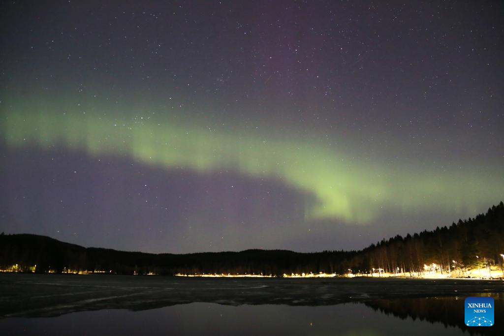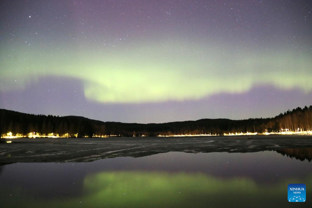 This photo taken on April 17, 2024 shows the northern lights at Sognsvann Lake in Oslo, capital of Norway. (Xinhua/Zhang Yuliang)