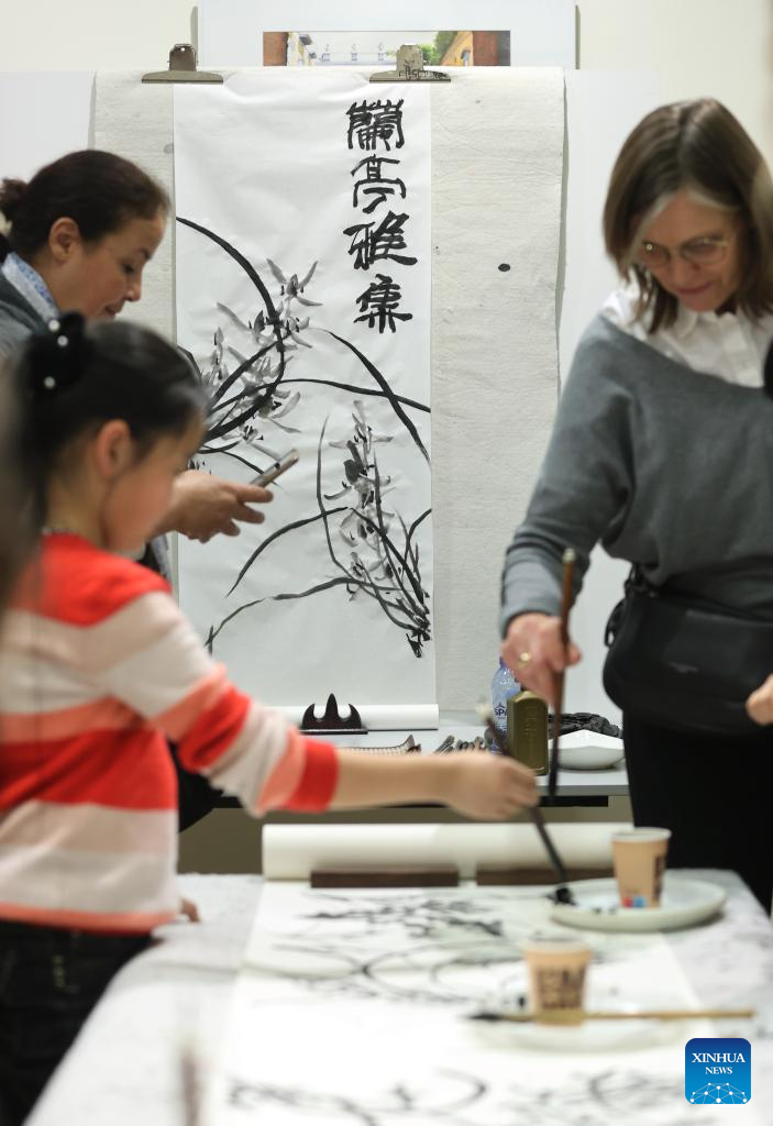 Visitors try Chinese calligraphy during the "Lanting" Culture Salon held at the China Culture Center in Brussels, Belgium, April 19, 2024. The "Lanting" Culture Salon was held here on Friday to mark the United Nations Chinese Language Day. (Xinhua/Zhao Dingzhe)