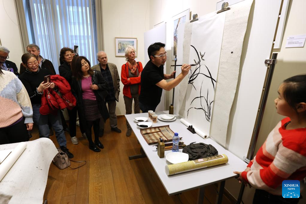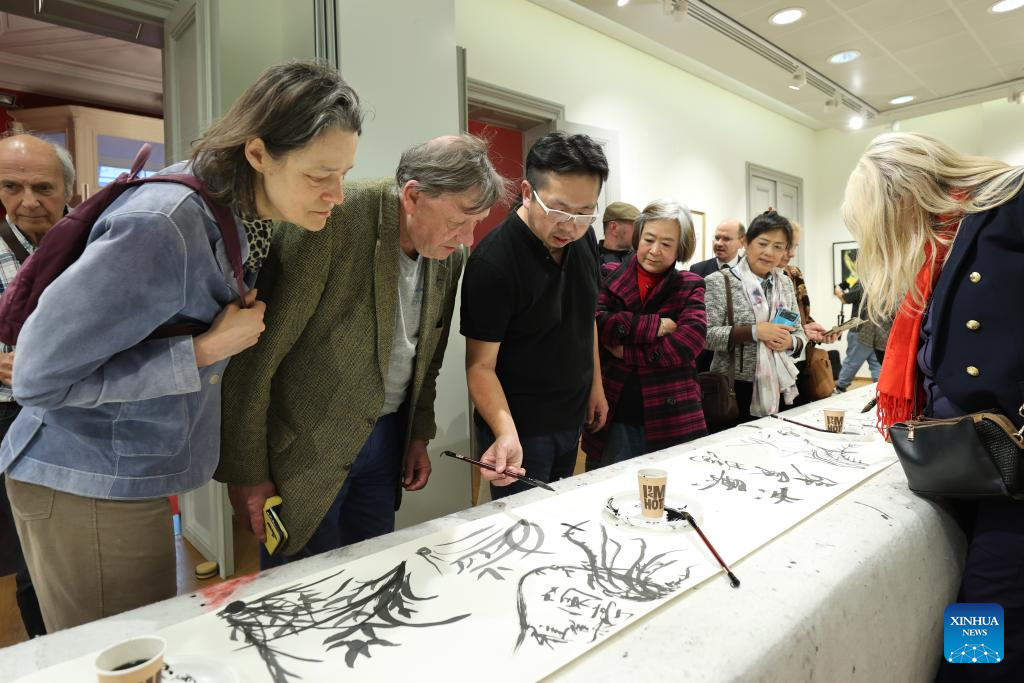 Visitors look on as a Chinese artist demonstrates the maneuver of a painting brush during the "Lanting" Culture Salon held at the China Culture Center in Brussels, Belgium, April 19, 2024. The "Lanting" Culture Salon was held here on Friday to mark the United Nations Chinese Language Day. (Xinhua/Zhao Dingzhe)