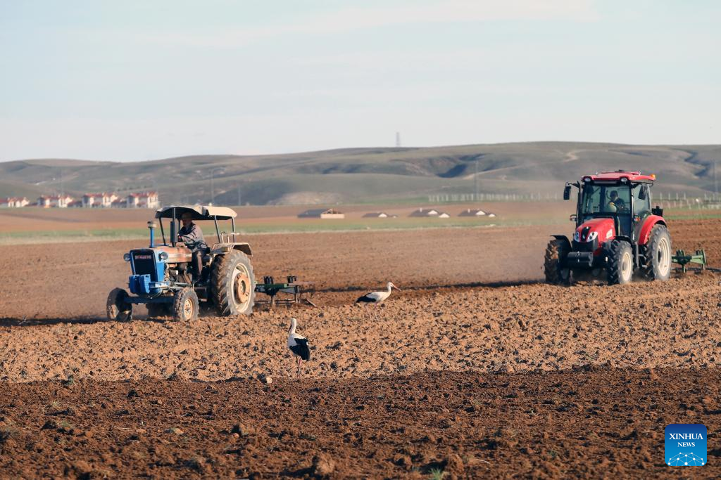 Farmers operate agricultural machines in a field in Ankara, Türkiye, April 23, 2024. (Mustafa Kaya/Handout via Xinhua)