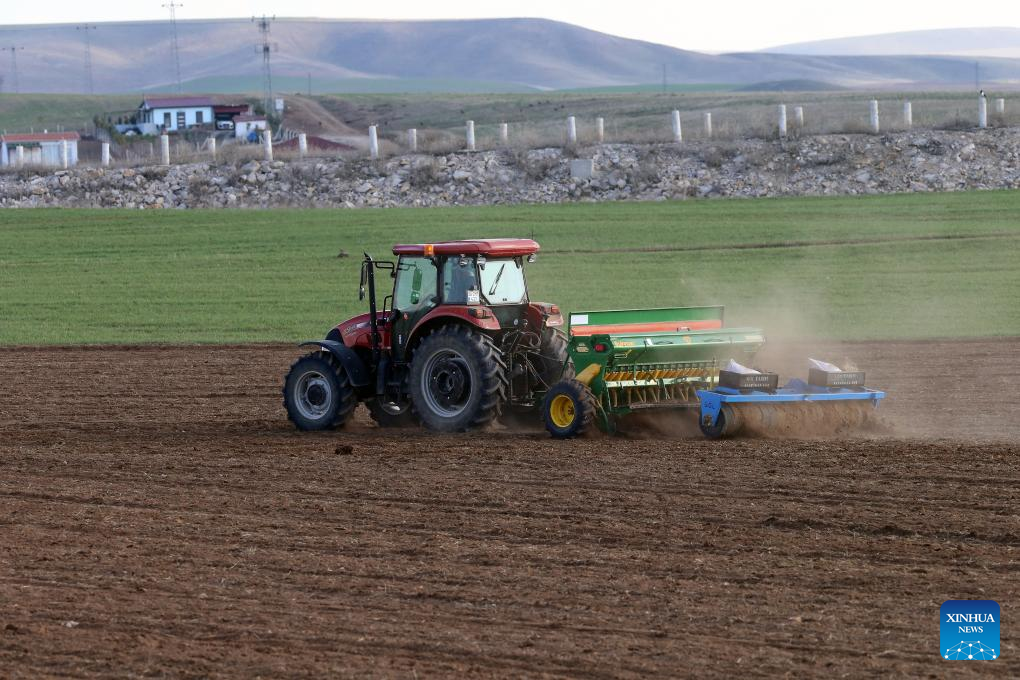 A farmer operates agricultural machines in a field in Ankara, Türkiye, April 23, 2024. (Mustafa Kaya/Handout via Xinhua)