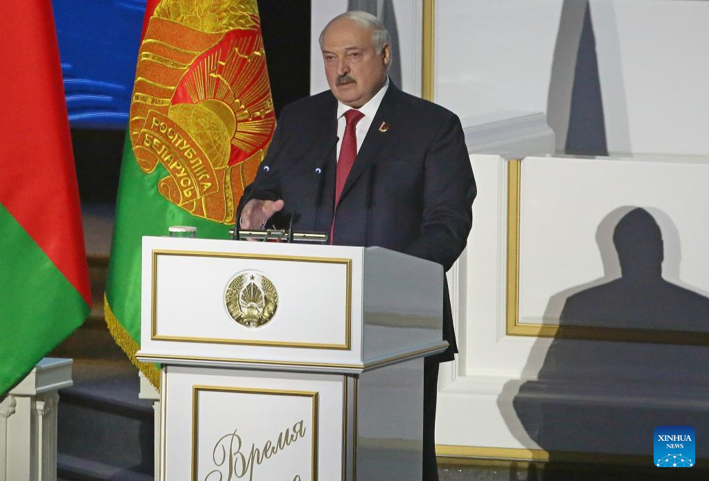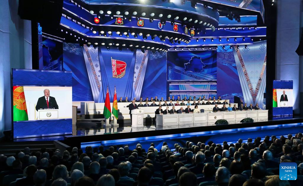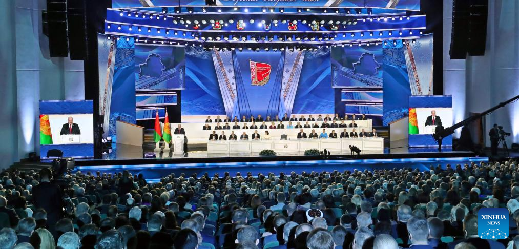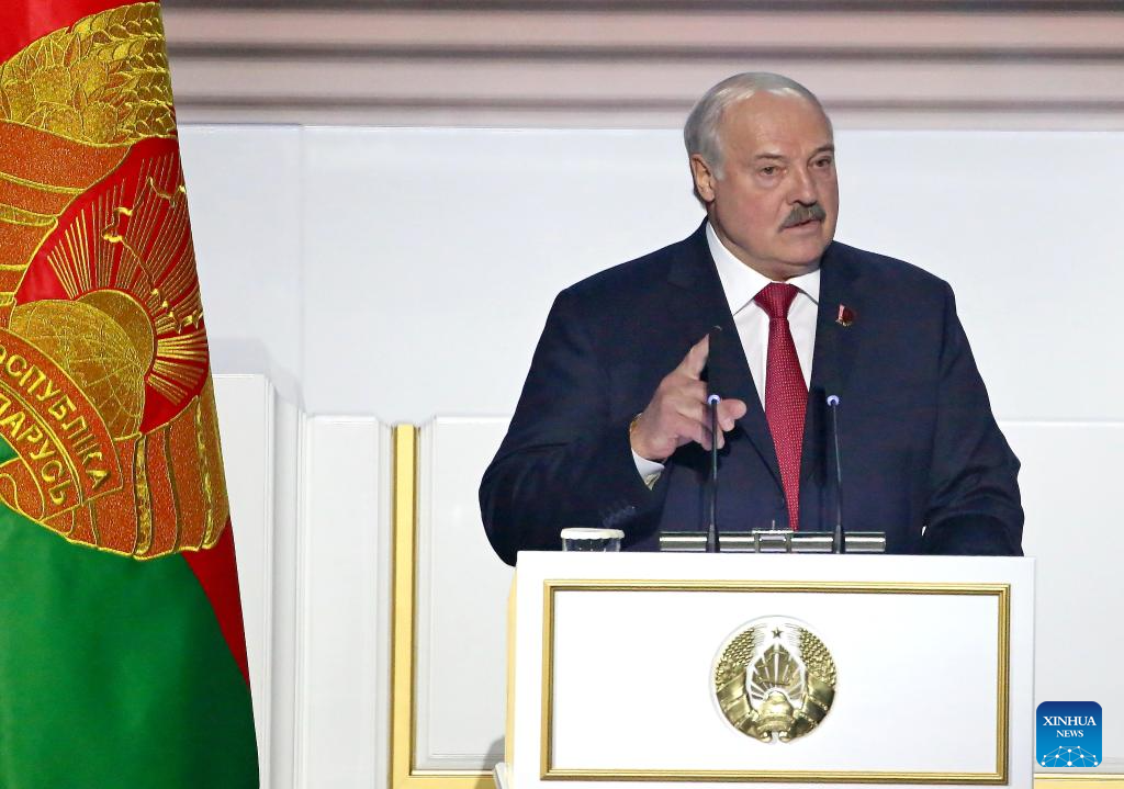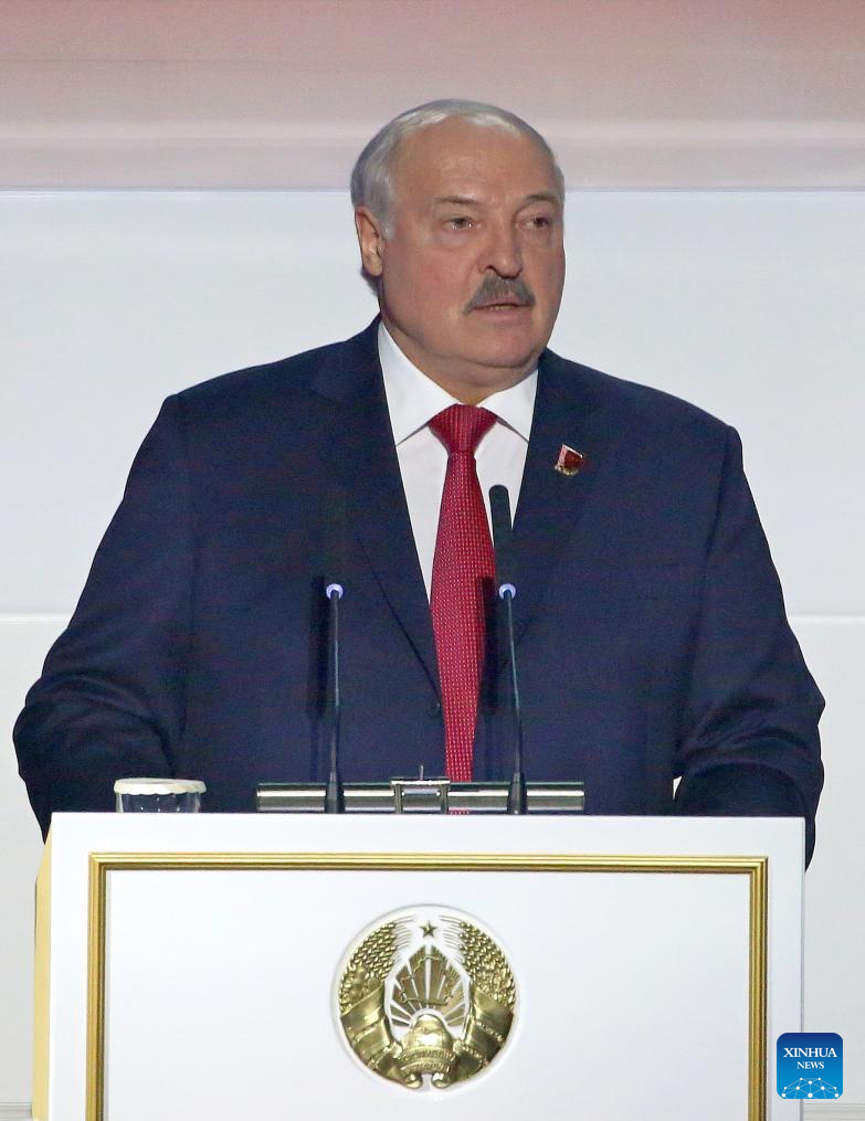 Belarusian President Alexander Lukashenko delivers a speech during the All-Belarusian People's Assembly in Minsk, Belarus, on April 24, 2024. Belarusian President Alexander Lukashenko was elected as the chair of the All-Belarusian People's Assembly on Wednesday, according to local media reports. (Photo by Henadz Zhikov/Xinhua)
