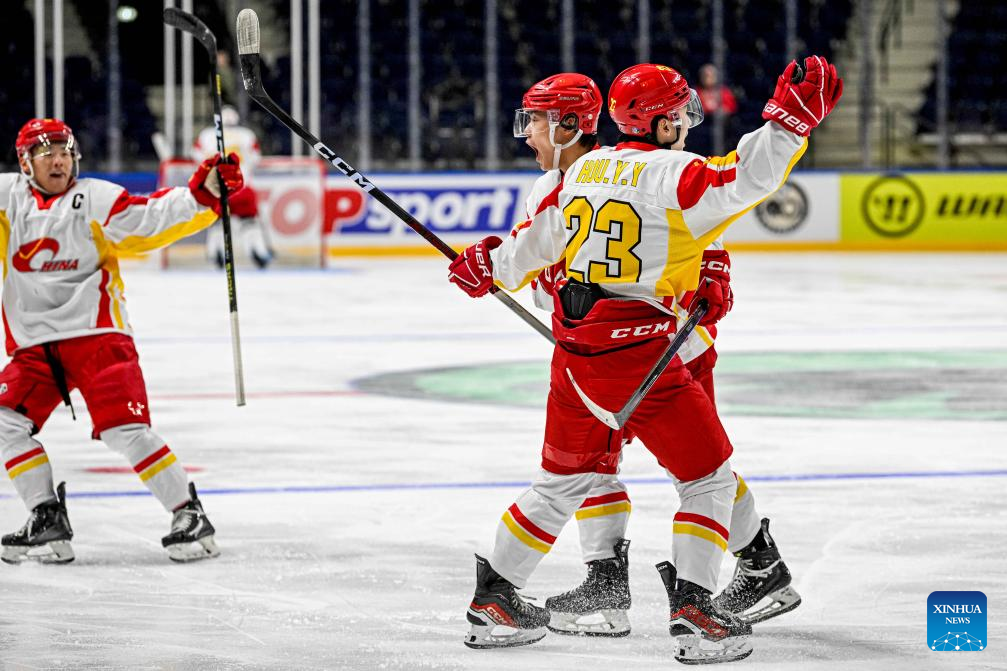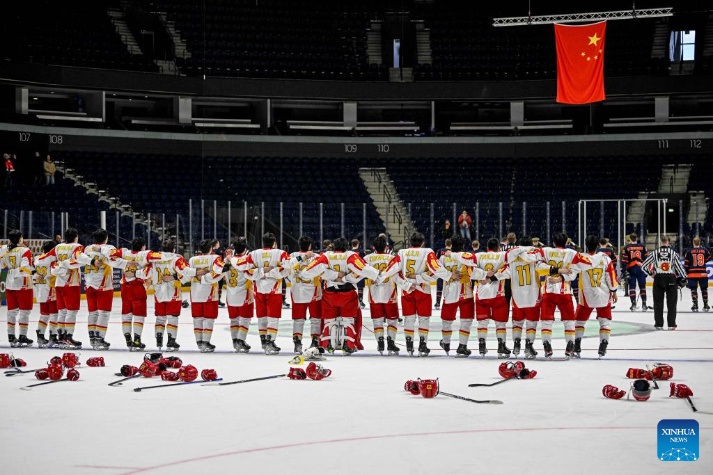 nd celebrate the victory after the match between China and the Netherlands at the 2024 IIHF Ice Hockey World Championship Division I-B in Vilnius, Lithuania, April 27, 2024. (Photo by Alfredas Pliadis/Xinhua)