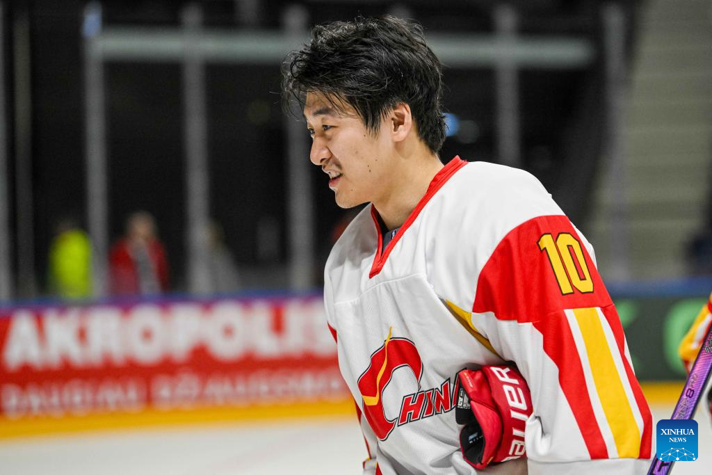 China's forwarder Zheng Mingju reacts during the match between China and the Netherlands at the 2024 IIHF Ice Hockey World Championship Division I-B in Vilnius, Lithuania, April 27, 2024. (Photo by Alfredas Pliadis/Xinhua)