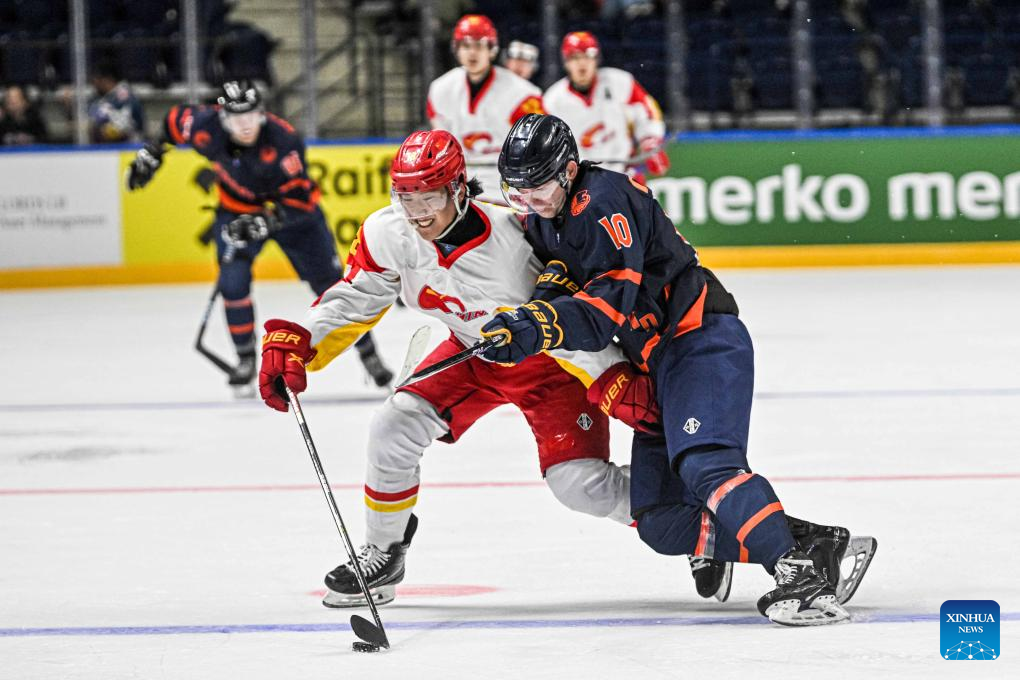 China's forwarder Yan Juncheng (L) vies with the Netherlands' forwarder Jonne de Bonth during the match between China and the Netherlands at the 2024 IIHF Ice Hockey World Championship Division I-B in Vilnius, Lithuania, April 27, 2024. (Photo by Alfredas Pliadis/Xinhua)