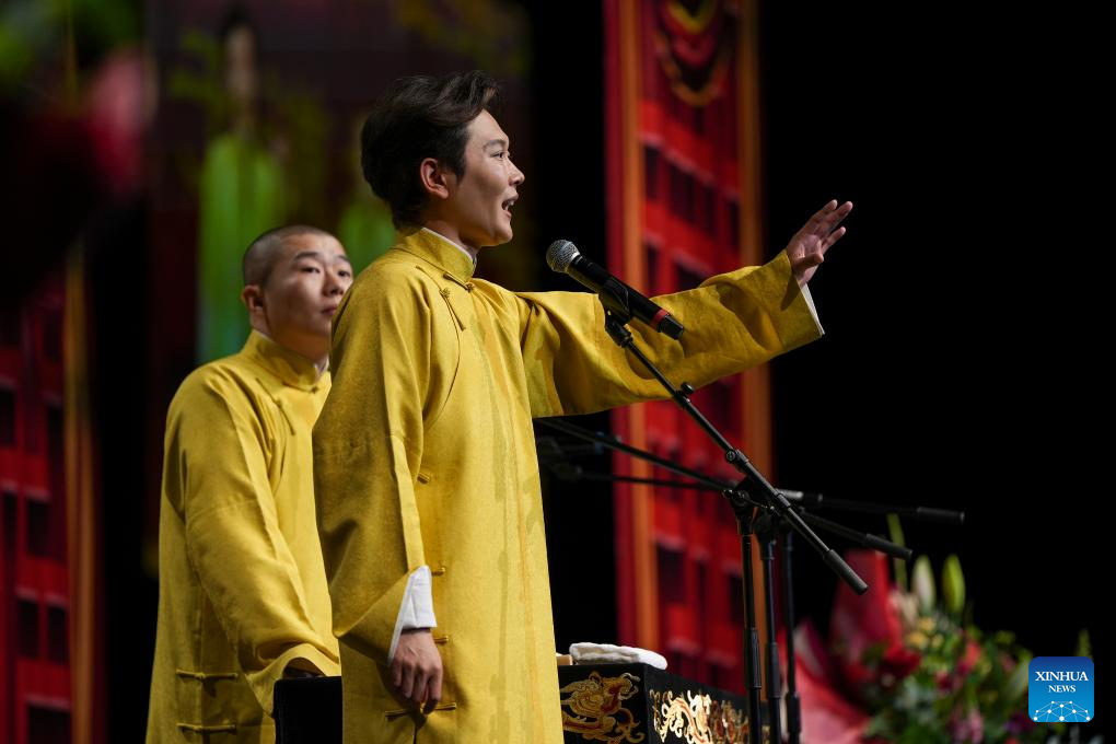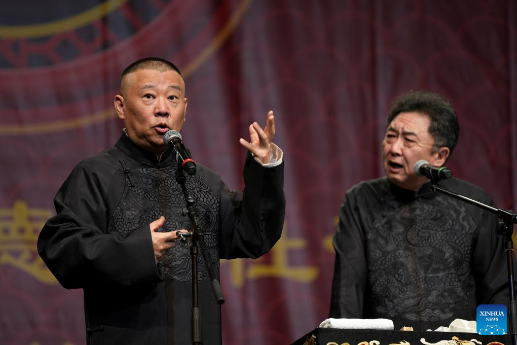 Along with Guo and his partner Yu Qian, a handful of comedians from the De Yun She Performance Group performed Xiangsheng, or crosstalk comedy, with both jokes about life anecdotes and traditional crosstalk episodes.(Xinhua/Wu Lu)