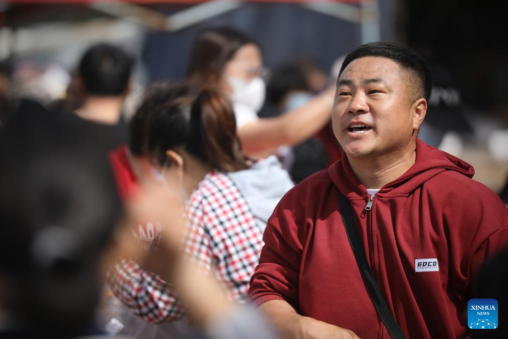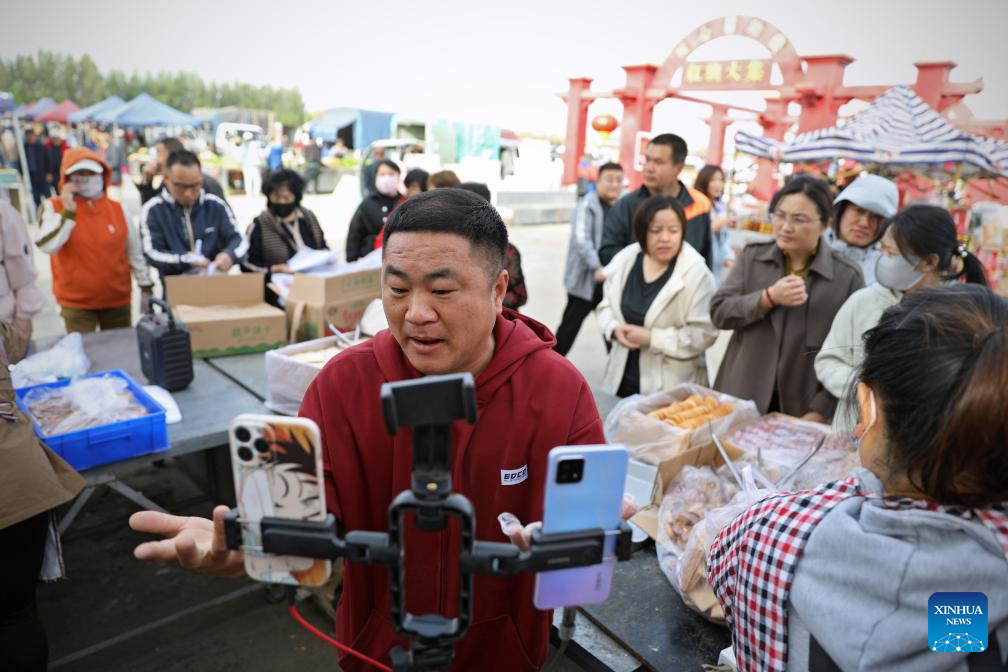 Wei Zhongshuai (C) talks with his fans via livestreaming at a market in Bayuquan District of Yingkou City in northeast China's Liaoning Province, April 25, 2024. (Xinhua/Yao Jianfeng)