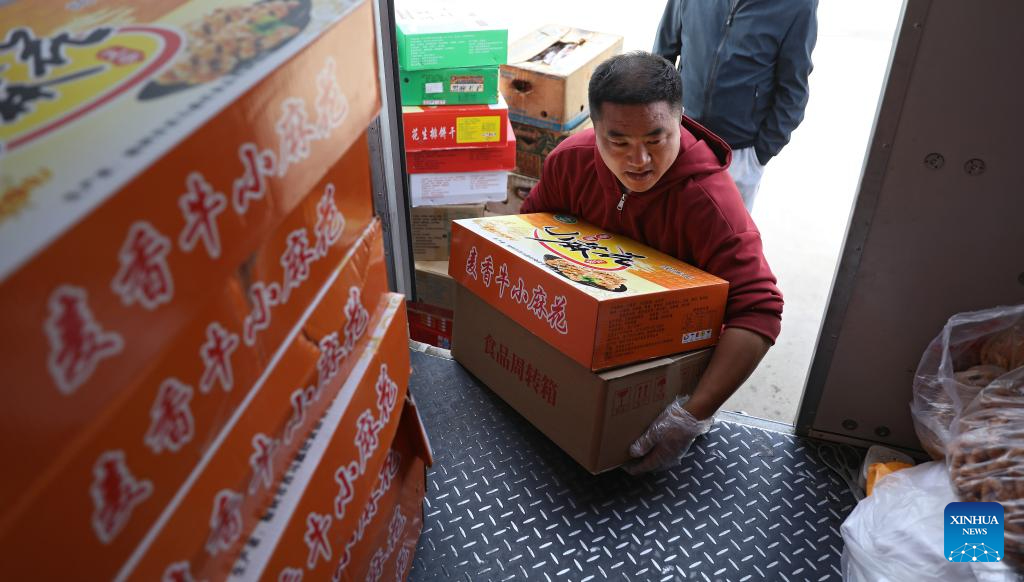 Wei Zhongshuai unloads boxes of biscuits at a market in Bayuquan District of Yingkou City in northeast China's Liaoning Province, April 25, 2024. (Xinhua/Yao Jianfeng)