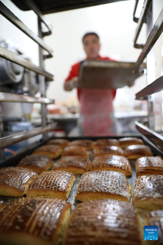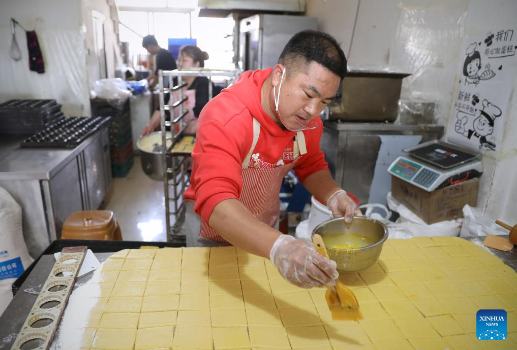 Wei Zhongshuai makes biscuits at his bakery in Xiongyue Town, Bayuquan District of Yingkou City in northeast China's Liaoning Province, April 24, 2024. (Xinhua/Yao Jianfeng)