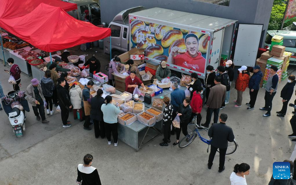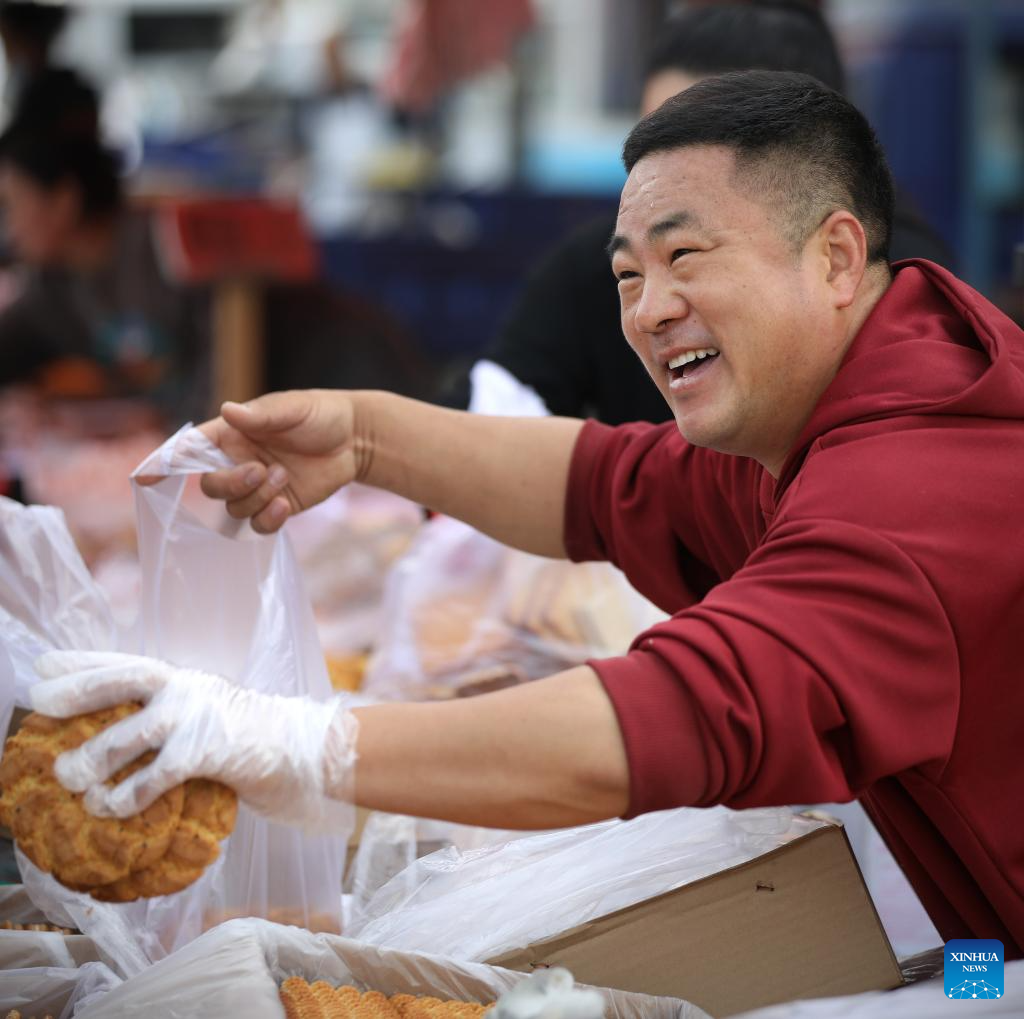 Wei Zhongshuai sells biscuits at a market in Bayuquan District of Yingkou City in northeast China's Liaoning Province, April 25, 2024. (Xinhua/Yao Jianfeng)