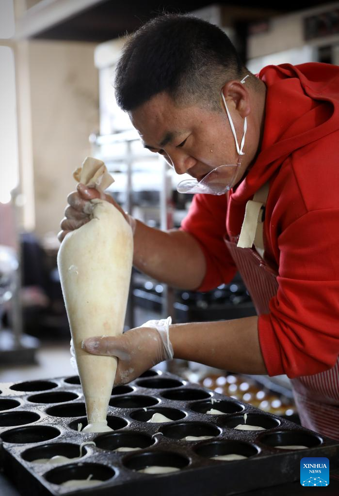 Wei Zhongshuai makes cakes at his bakery in Xiongyue Town, Bayuquan District of Yingkou City in northeast China's Liaoning Province, April 24, 2024. (Xinhua/Yao Jianfeng)