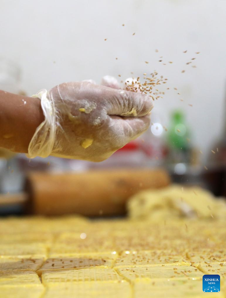 Wei Zhongshuai adds sesame to biscuits at his bakery in Xiongyue Town, Bayuquan District of Yingkou City in northeast China's Liaoning Province, April 24, 2024. (Xinhua/Yao Jianfeng)