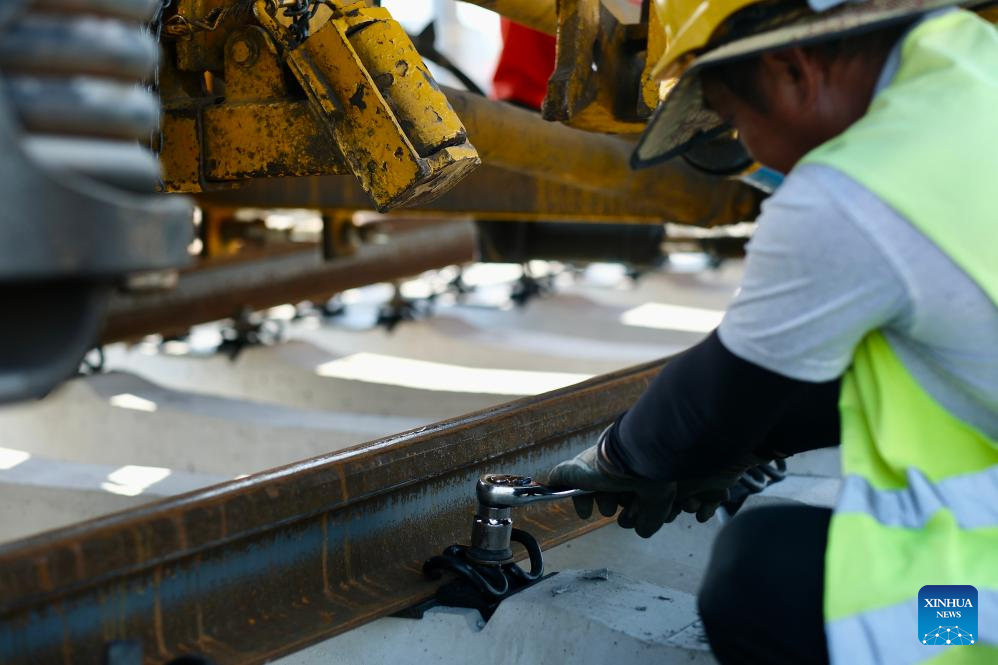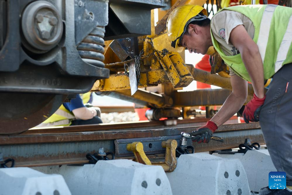 A construction worker of the Belgrade-Budapest railway project works on the tracks on the Novi Sad-Subotica section in Sajlovo, Serbia, on April 11, 2024. Once operational, the high-speed railway will be equipped with modern signaling and safety systems, significantly reducing travel time between the two cities. (Xinhua/Zheng Kaijun)