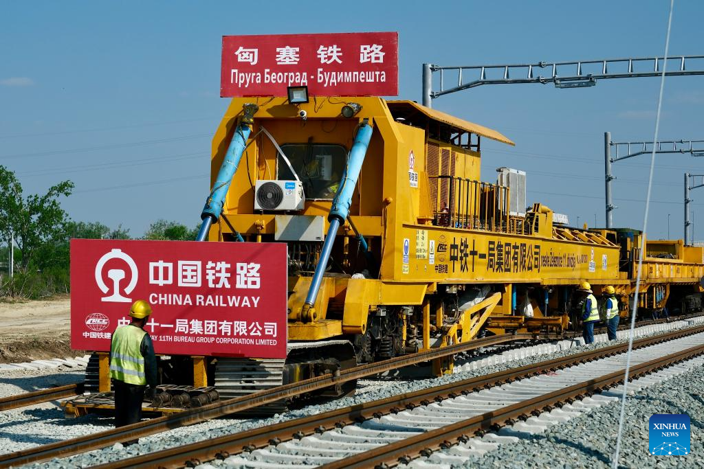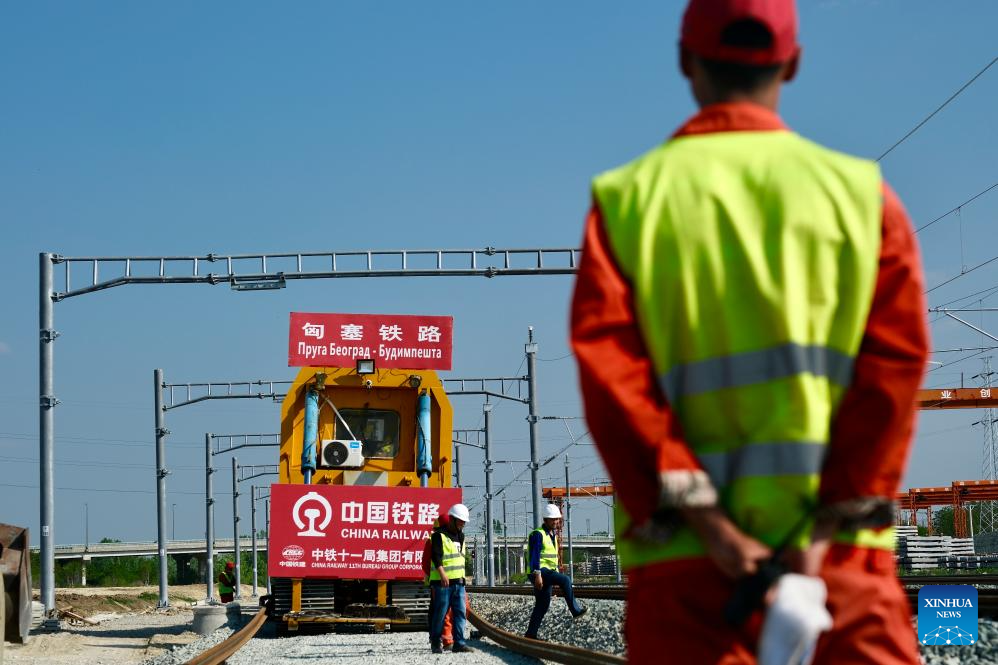 Construction workers of the Belgrade-Budapest railway project work on the tracks on the Novi Sad-Subotica section in Sajlovo, Serbia, on April 11, 2024. Once operational, the high-speed railway will be equipped with modern signaling and safety systems, significantly reducing travel time between the two cities. (Xinhua/Zheng Kaijun)