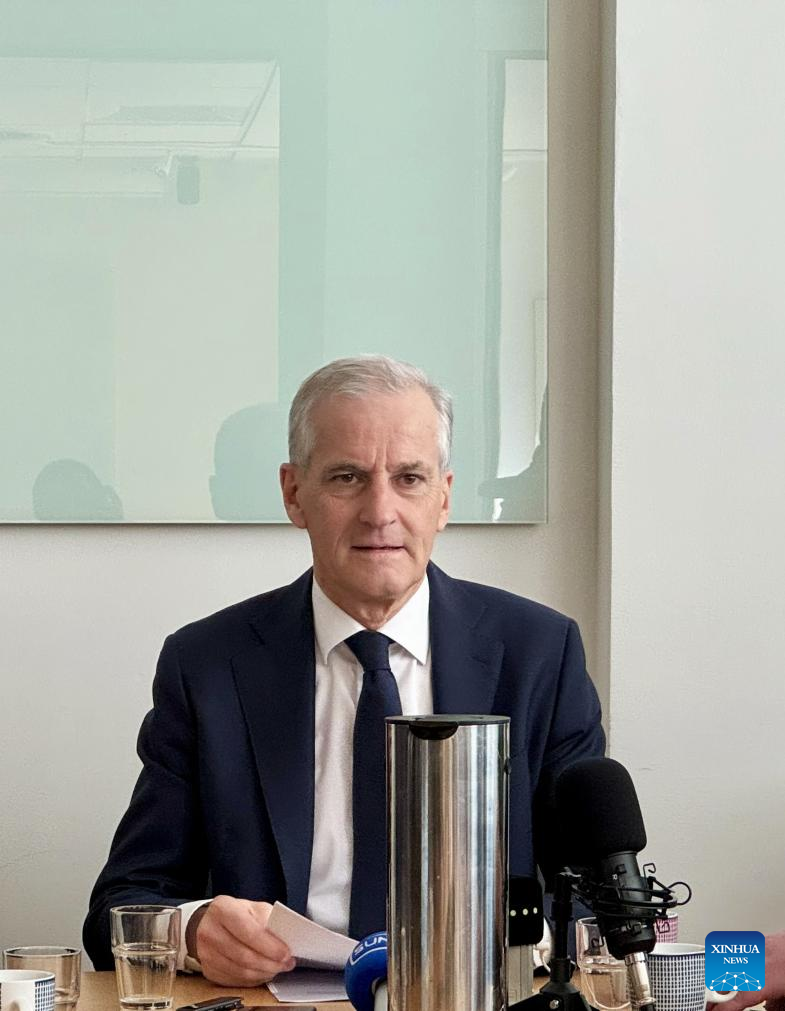 Norwegian Prime Minister Jonas Gahr Store speaks during a meeting with foreign journalists in Oslo, Norway, on April 30, 2024. Store said Tuesday that his government will enhance cooperation with China. (Photo by Chen Yaqin/Xinhua)