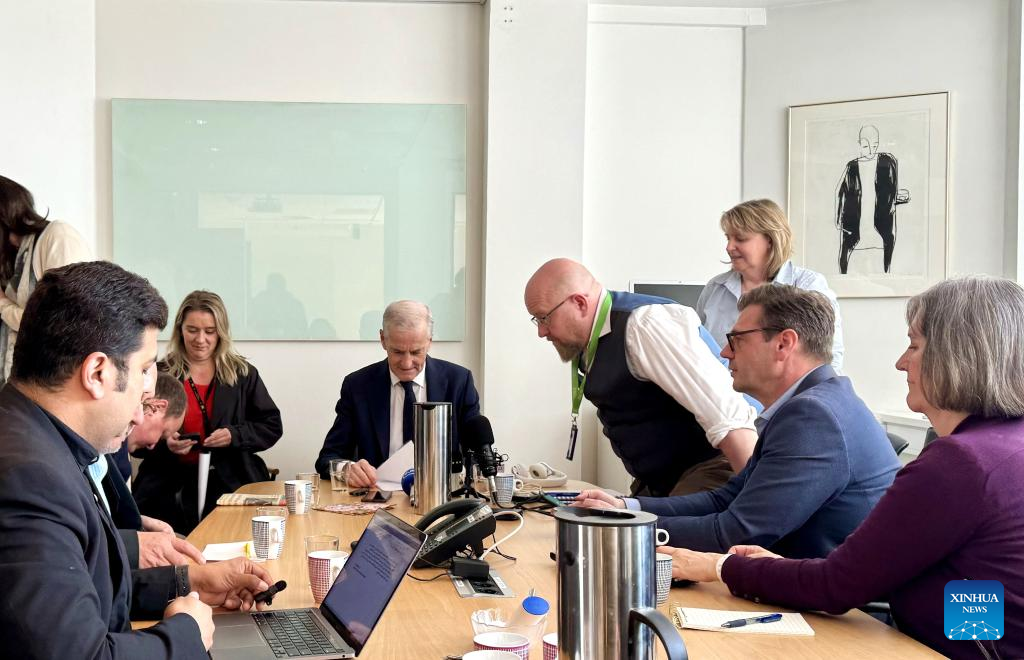 Norwegian Prime Minister Jonas Gahr Store (C) meets with foreign journalists in Oslo, Norway, on April 30, 2024. Store said Tuesday that his government will enhance cooperation with China. (Photo by Chen Yaqin/Xinhua)
