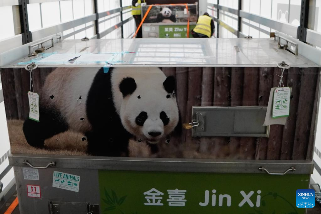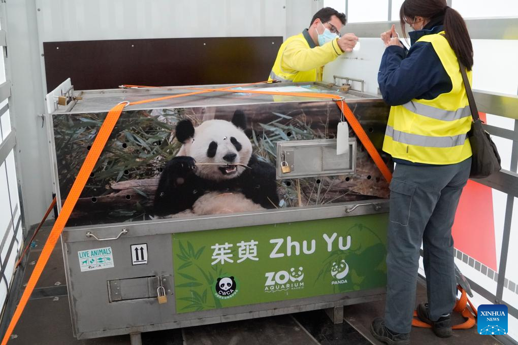 On an exclusive flight from the southwestern Chinese city of Chengdu in Sichuan Province, the couple, named Jin Xi and Zhu Yu, landed on Monday at the cargo terminal of the Adolfo Suarez Madrid-Barajas International Airport, the Madrid Zoo Aquarium said.