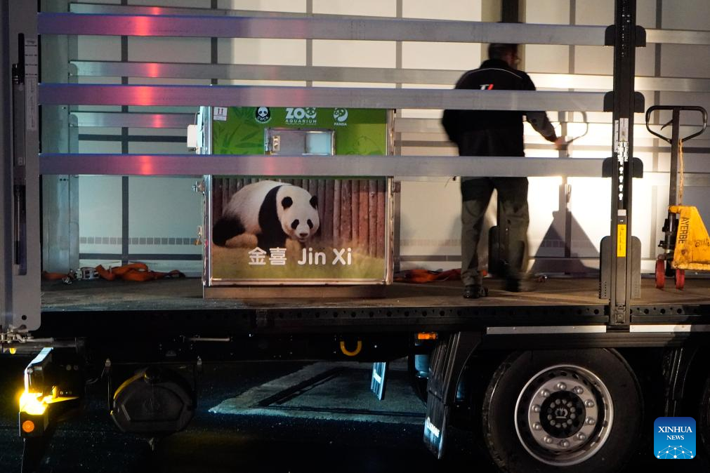 Staff members transport giant panda couple Jin Xi and Zhu Yu in Madrid, Spain, April 29, 2024. A giant panda couple has arrived in Spain on a direct flight from China. They were set to be kept at zoo in the Spanish capital city of Madrid for the next few years, the zoo announced on Tuesday. On an exclusive flight from the southwestern Chinese city of Chengdu in Sichuan Province, the couple, named Jin Xi and Zhu Yu, landed on Monday at the cargo terminal of the Adolfo Suarez Madrid-Barajas International Airport, the Madrid Zoo Aquarium said. (Madrid Zoo Aquarium/Handout via Xinhua)