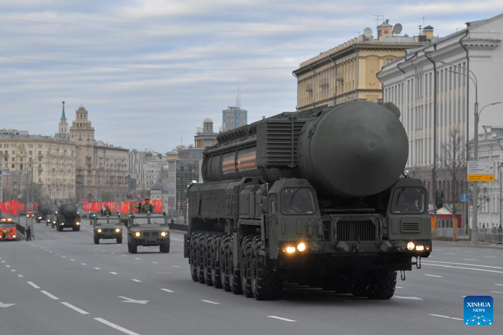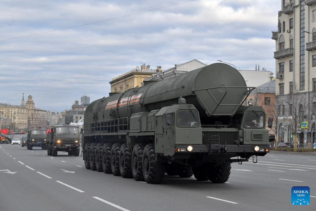 A Russian missile launcher drives along a street to attend a rehearsal for the Victory Day military parade in Moscow, Russia, on May 2, 2024. (Photo by Alexander Zemlianichenko Jr/Xinhua)