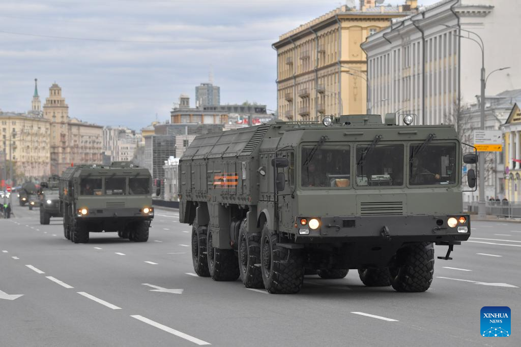Russian mobile short-range ballistic missile system launchers Iskander drive along a street to attend a rehearsal for the Victory Day military parade in Moscow, Russia, on May 2, 2024. (Photo by Alexander Zemlianichenko Jr/Xinhua)