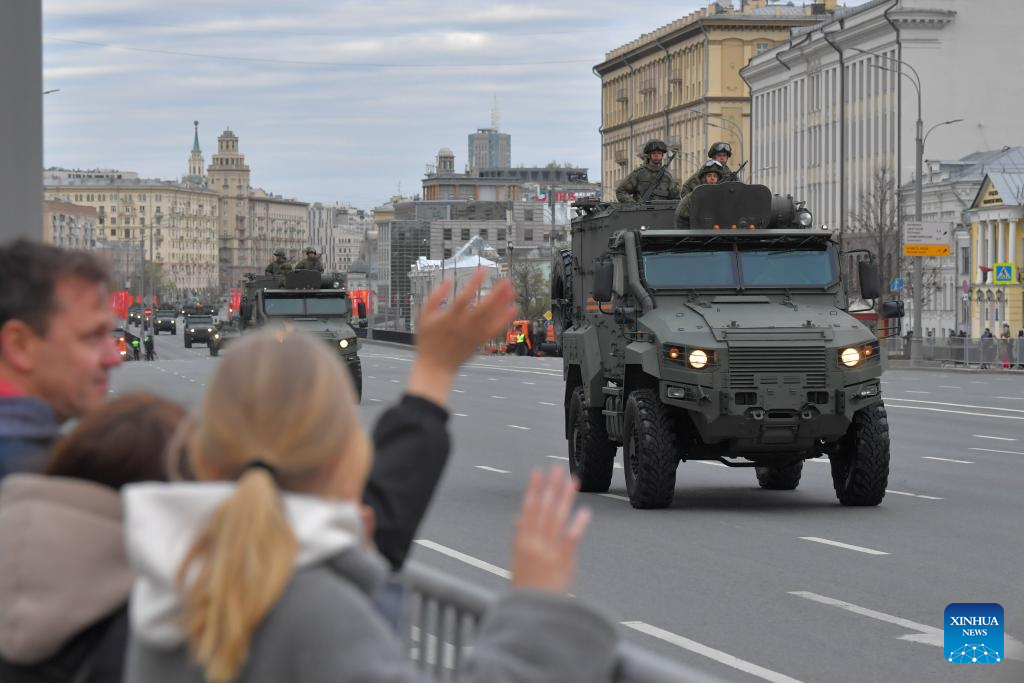 Russian military vehicles drive along a street to attend a rehearsal for the Victory Day military parade in Moscow, Russia, on May 2, 2024. (Photo by Alexander Zemlianichenko Jr/Xinhua)