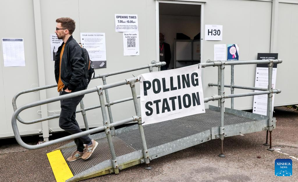 A voter leaves a polling station in London, Britain, May 2, 2024. Britain's ruling Conservative Party has suffered one of its worst ever election days as massive numbers of voters switched their allegiance in town hall elections across England. (Xinhua)