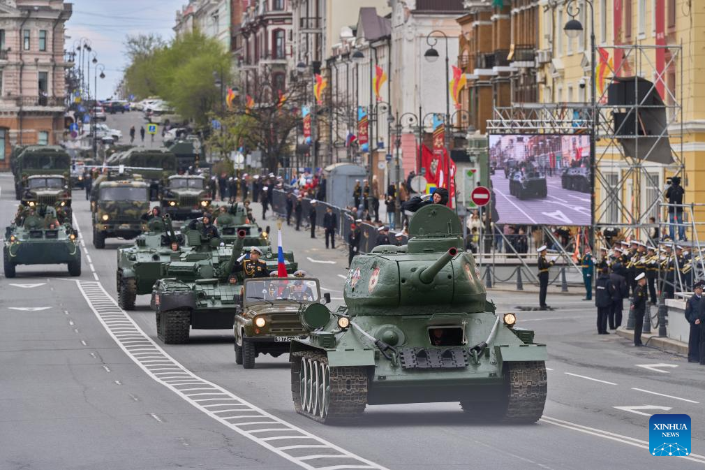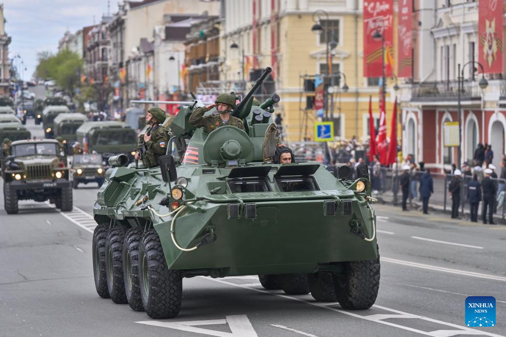 Armored vehicles attend a rehearsal for the Victory Day military parade, which marks the 79th anniversary of the Soviet victory in the Great Patriotic War, Russia's term for World War II, in Vladivostok, Russia on May 7, 2024. (Photo by Guo Feizhou/Xinhua)