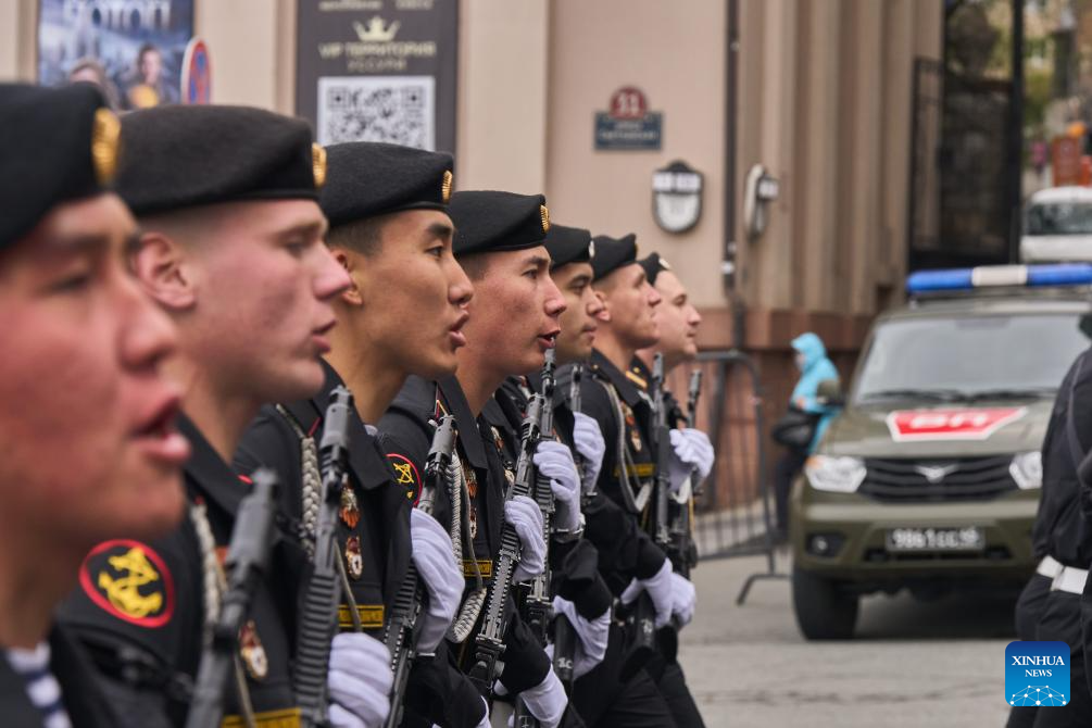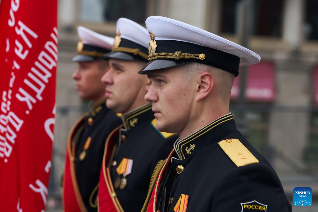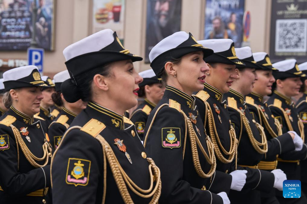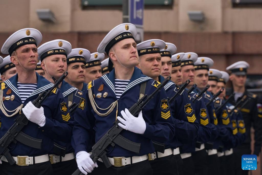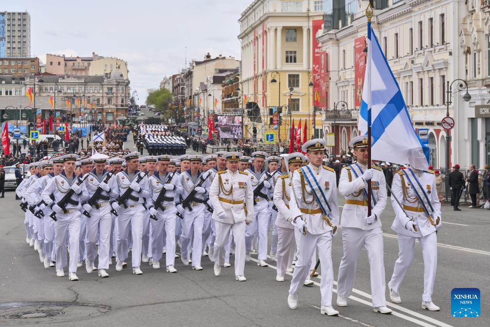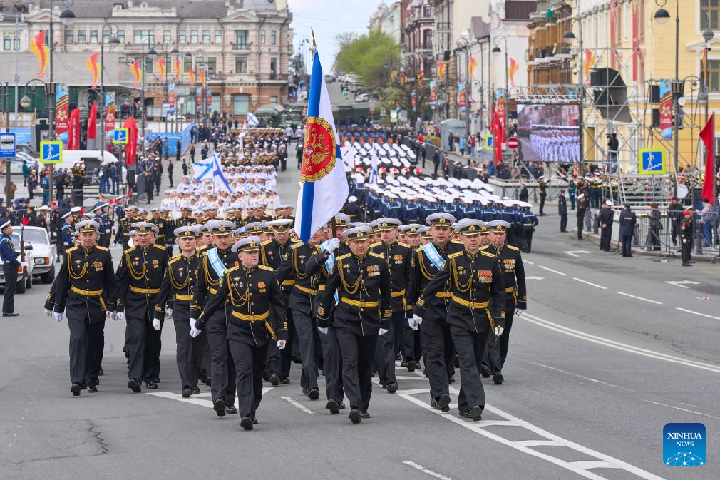 Soldiers attend a rehearsal for the Victory Day military parade, which marks the 79th anniversary of the Soviet victory in the Great Patriotic War, Russia's term for World War II, in Vladivostok, Russia on May 7, 2024. (Photo by Guo Feizhou/Xinhua)