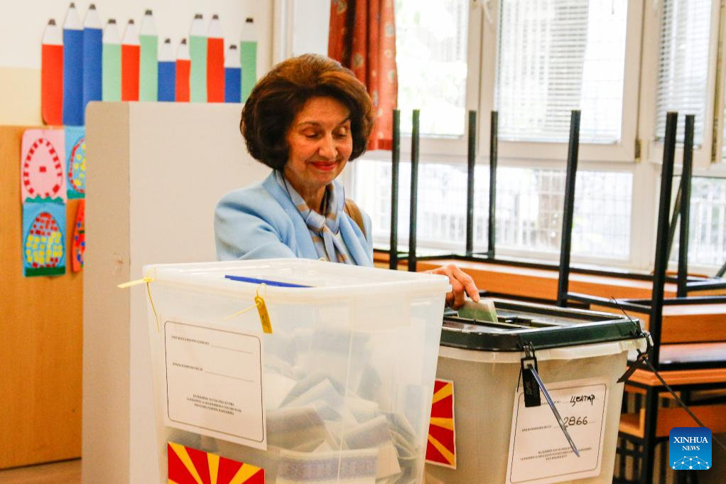 Presidential candidate Gordana Siljanovska Davkova of VMRO-DPMNE casts the vote at a polling station in Skopje, North Macedonia, May 8, 2024. Parliamentary elections and the second round of presidential elections kicked off in North Macedonia on Wednesday. (Photo by Tomislav Georgiev/Xinhua)