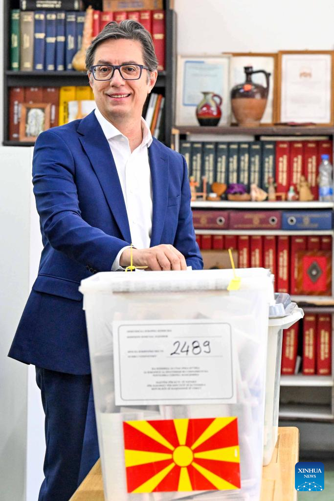 Incumbent President and presidential candidate for the Social Democratic Union of Macedonia Stevo Pendarovski casts the vote at a polling station in Skopje, North Macedonia, May 8, 2024. Parliamentary elections and the second round of presidential elections kicked off in North Macedonia on Wednesday. (Photo by Tomislav Georgiev/Xinhua)