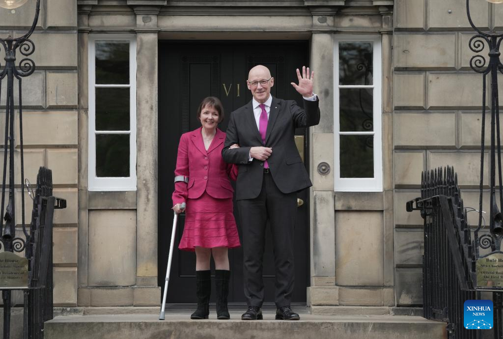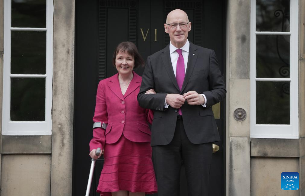 John Swinney arrives at Bute House with his wife in Edinburgh, Britain, on May 7, 2024. (Scottish government/Handout via Xinhua)