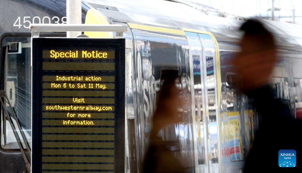Passengers walk past a notice of industrial action at Waterloo Station in London, Britain, on May 8, 2024. Train drivers in Britain went on a fresh wave of strikes and overtime bans, disrupting rail travel this week. (Xinhua/Li Ying)