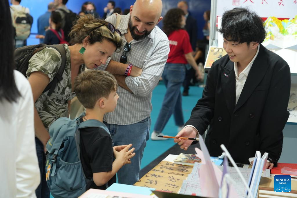 Visitors learns about Chinese calligraphy during the Turin International Book Fair in Turin, Italy, May 11, 2024. (Xinhua/Ren Yaoting)