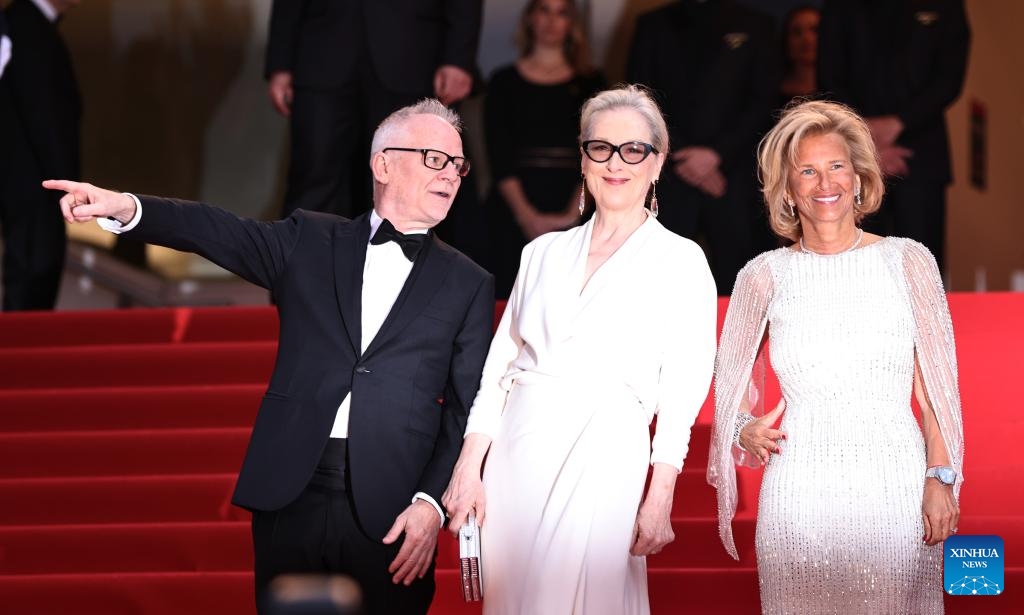American actress Meryl Streep (C), Cannes Film Festival's President Iris Knobloch (R) and General Delegate Thierry Fremaux appear on the red carpet of the opening ceremony during the 77th edition of the Cannes Film Festival in Cannes, southern France, on May 14, 2024. The 77th edition of the Cannes Film Festival opened Tuesday on the French Riviera, with a selection of 22 films vying for the coveted Palme d'Or.