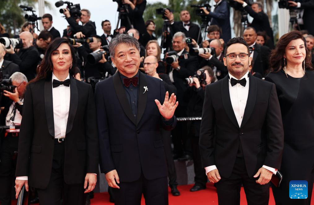 Japanese director Kore-eda Hirokazu (2nd L), also a jury member of the 77th edition of the Cannes Film Festival, arrives at the red carpet of the opening ceremony during the festival in Cannes, southern France, on May 14, 2024. The 77th edition of the Cannes Film Festival opened Tuesday on the French Riviera, with a selection of 22 films vying for the coveted Palme d'Or.