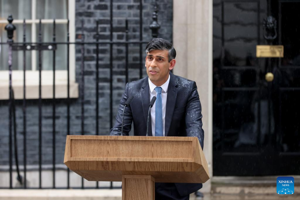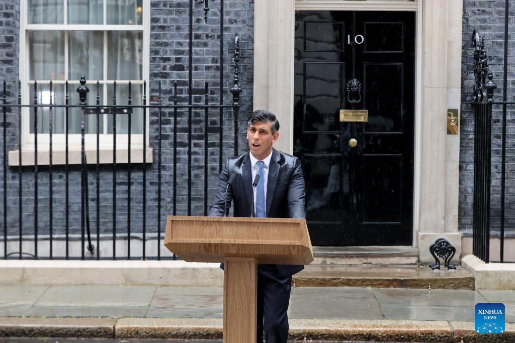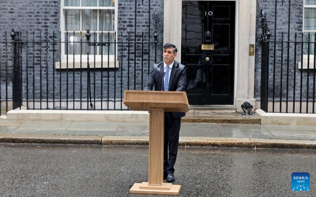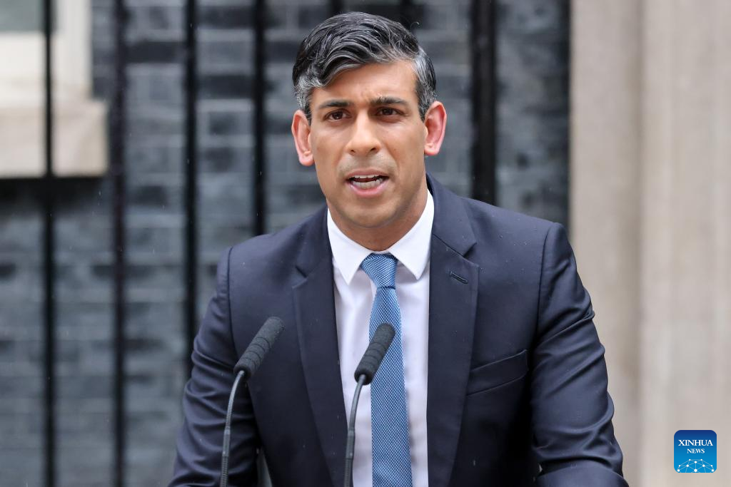 British Prime Minister Rishi Sunak speaks outside 10 Downing Street in London, Britain, on May 22, 2024. Sunak announced on Wednesday that the country will hold a general election on July 4. (Xinhua)