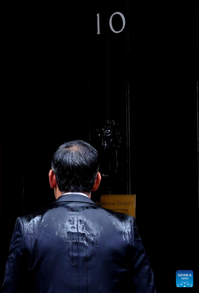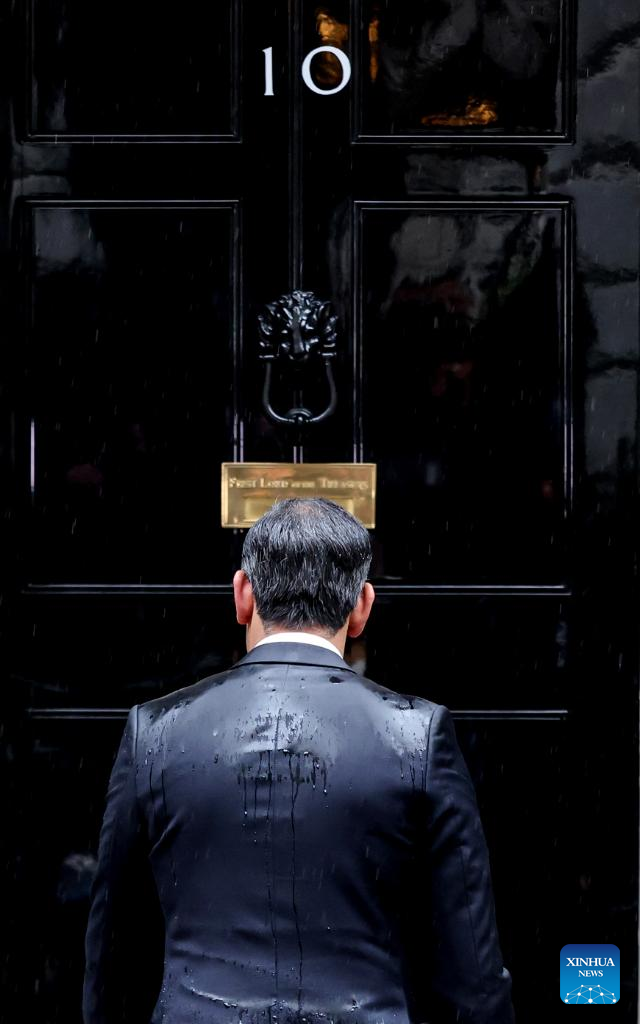 British Prime Minister Rishi Sunak returns to 10 Downing Street after delivering a speech in London, Britain, on May 22, 2024. Sunak announced on Wednesday that the country will hold a general election on July 4. (Xinhua)