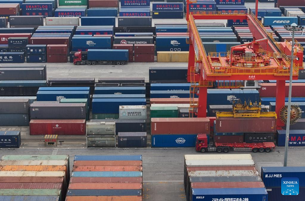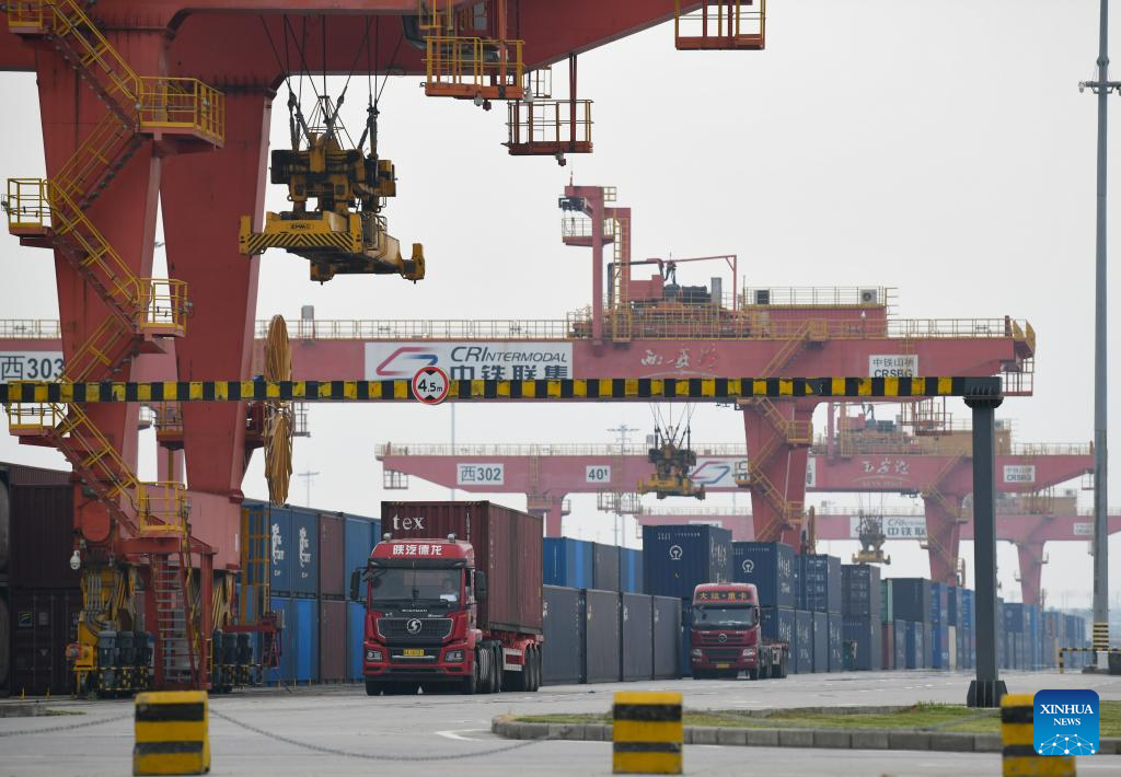 Trucks transport containers at Xi'an international port station in Xi'an, the capital city of northwest China's Shaanxi Province, May 25, 2024. A train fully loaded with diverse goods departed from Xi'an on Saturday morning, bound for Malaszewicze, Poland, marking a significant milestone as the total number of China-Europe freight train trips has surpassed 90,000.