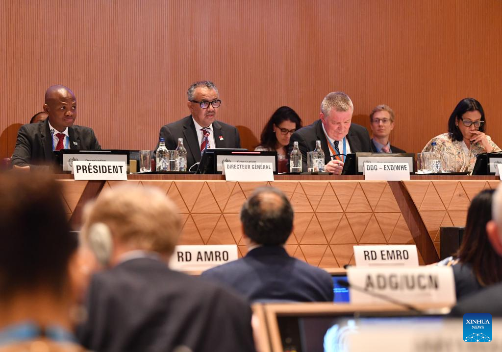 Tedros Adhanom Ghebreyesus (2nd L), director-general of the World Health Organization (WHO), speaks at the 77th World Health Assembly (WHA) in Geneva, Switzerland, May 27, 2024. The six-day 77th WHA, themed "All for Health, Health for All," opened here on Monday. (Xinhua/Lian Yi)