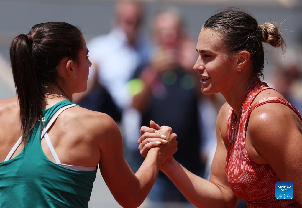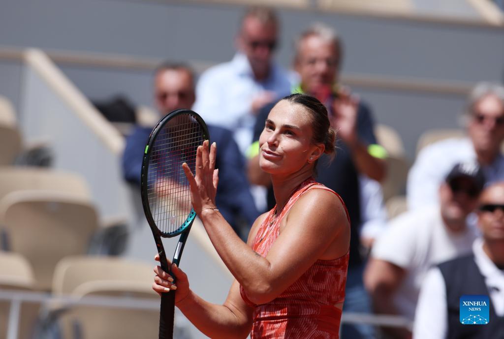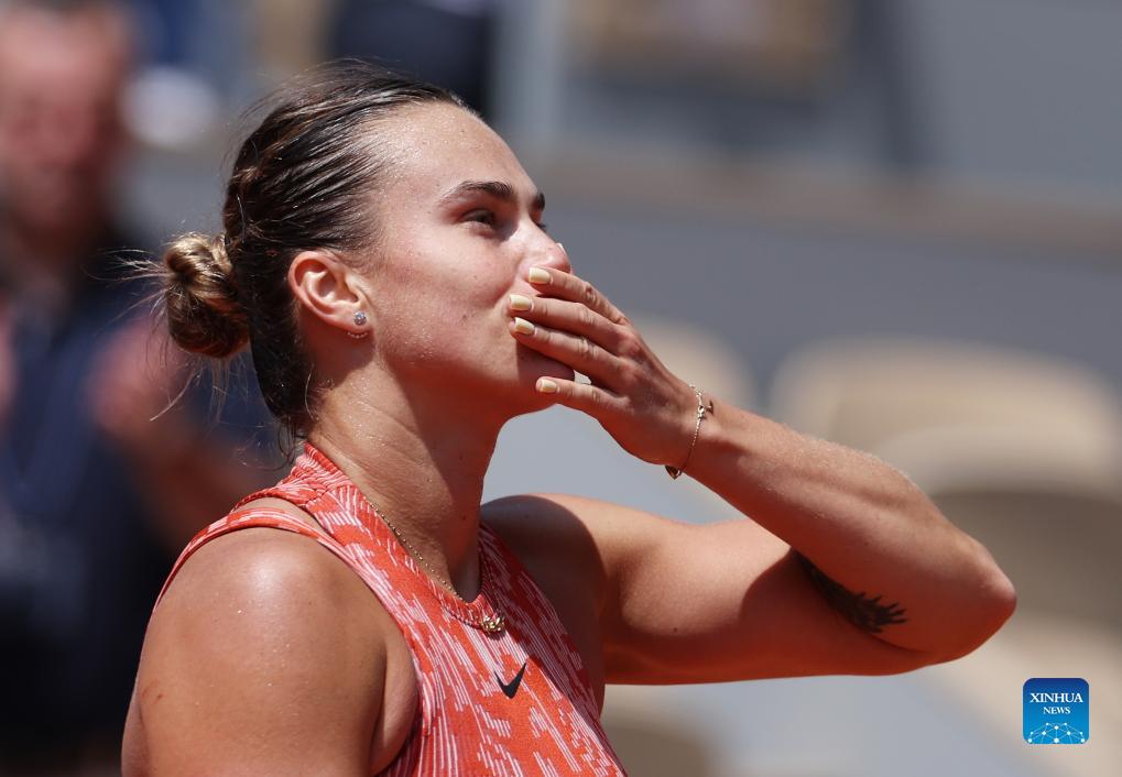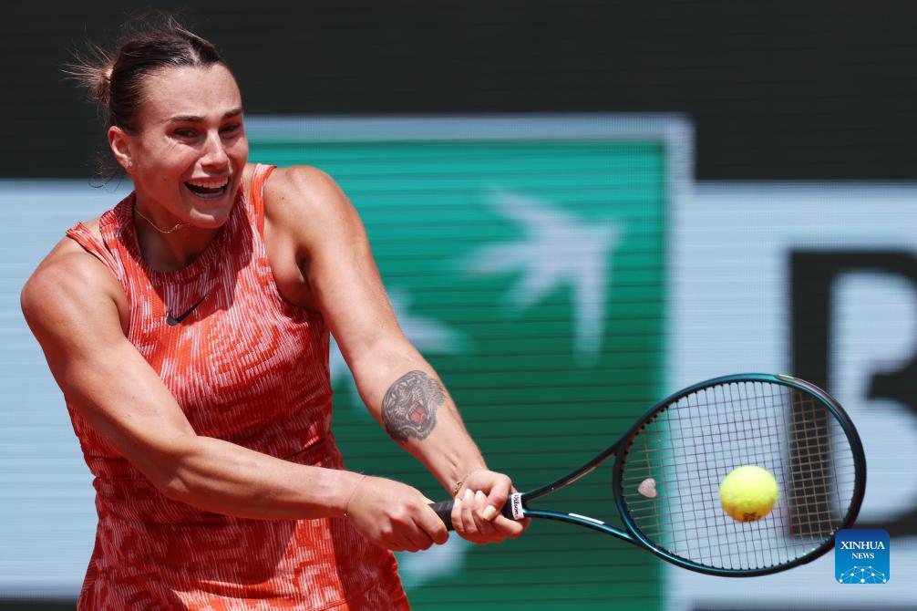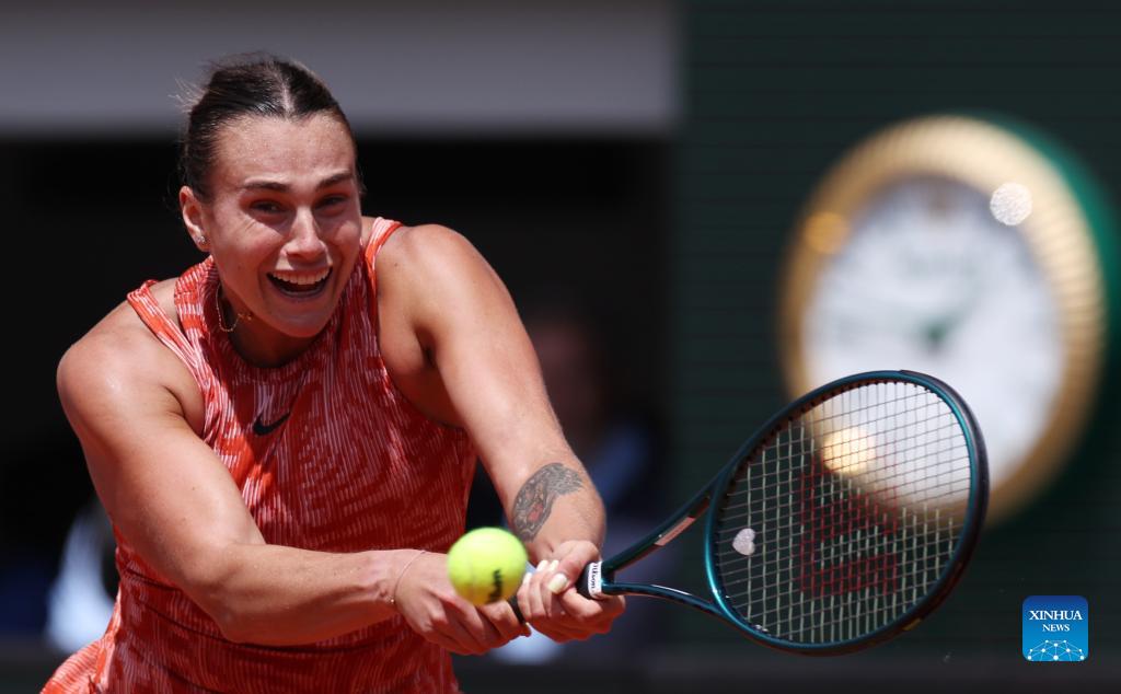 PARIS, June 3 (Xinhua) -- Aryna Sabalenka continued her bid for back-to-back majors as the world No. 2 stormed into the last eight after a straight-set victory over American fourth-round debutant Emma Navarro in Paris on Monday.