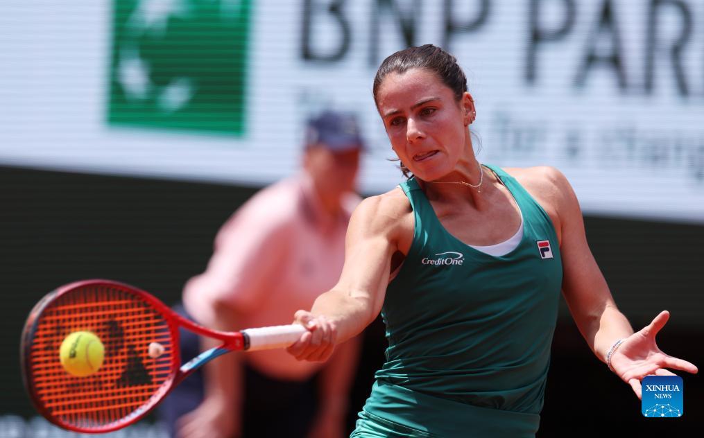 Emma Navarro hits a return during the women's singles round of 16 match between Aryna Sabalenka of Belarus and Emma Navarro of the United States at the French tennis tournament in Paris, France, June 3, 2024. (Xinhua/Gao Jing)
