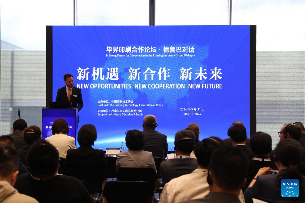 People attend the "Bi Sheng Forum for Cooperation in the Printing Industry -- Drupa Dialogue", a side event of 2024 Drupa exhibition, in Dusseldorf, Germany, May 31, 2024. (Xinhua/Du Zheyu)