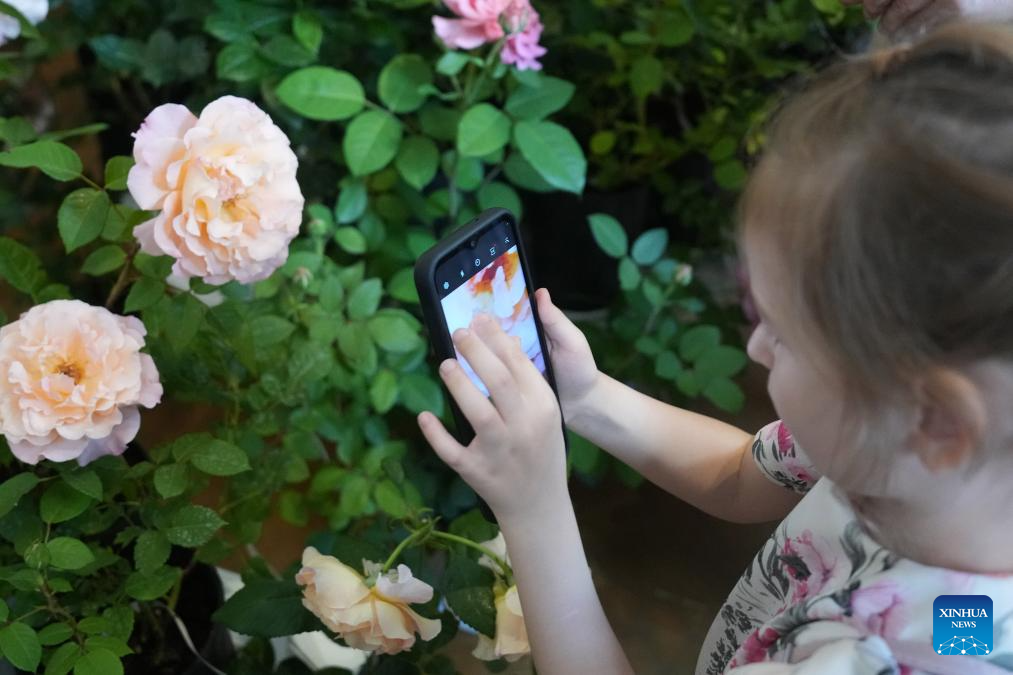 A girl takes photos of roses at the "Roses 2024" exhibition in Latvian Museum of Natural History in Riga, Latvia, June 5, 2024. The exhibition is held annually by the Latvian Museum of Natural History. More than 100 varieties of roses are on display this year. (Photo by Edijs Palens/Xinhua)