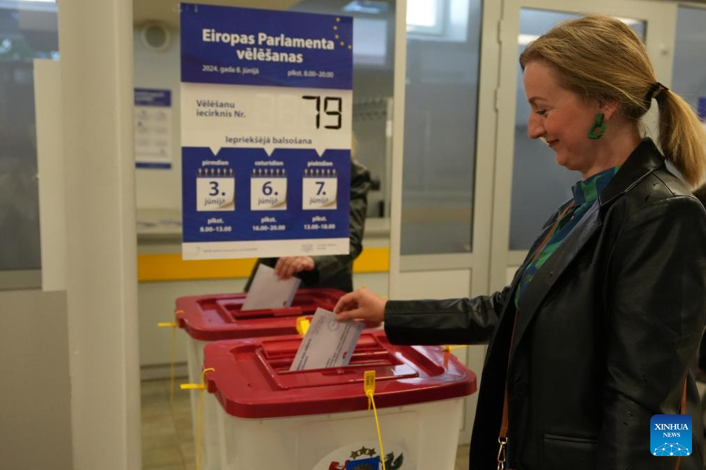 A woman casts her vote for the European Parliament elections at a polling station in Riga, Latvia, June 8, 2024. (Photo by Janis Laizans/Xinhua)