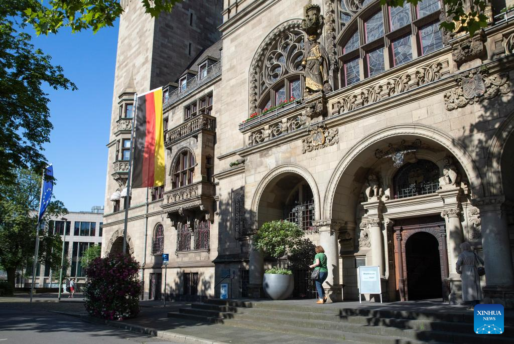 A voter walks out of a polling station at the city hall for the European Parliament elections in Duisburg, Germany, June 9, 2024. (Xinhua/Zhang Fan)